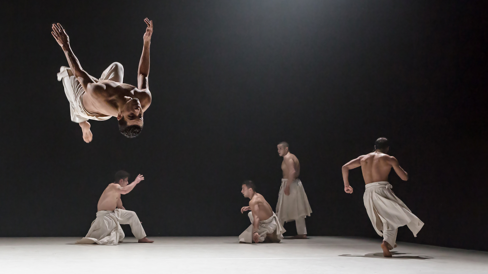 A French choreographer of Algerian descent, born to a Muslim mother and Jewish father, Hervé Koubi has long been fascinated by the historical coming together and coming apart of different groups, and the different vantage points from which history books have been written. In Les Nuits barbares, ou les premiers matins du monde (Barbarian Nights, or The First Mornings of the World), Koubi’s choreography questions the notion of “barbarism” while recounting the cultural history of the Mediterranean and the cycles of invasion and assimilation imposed on its peoples from within and without.